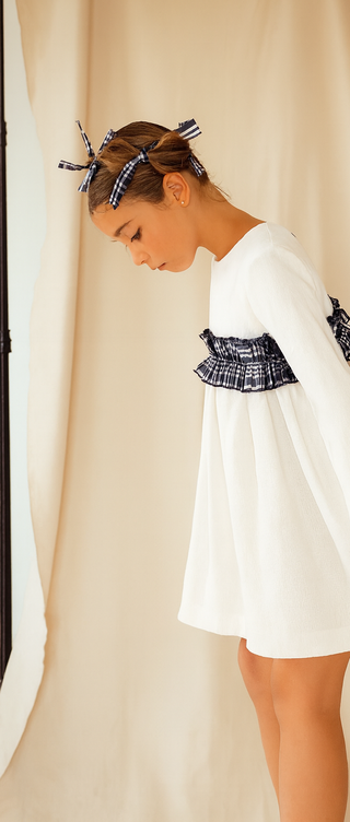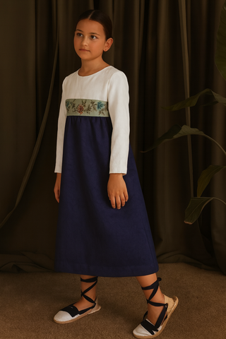 Vestido El Palmar MIDI opción otoño invierno con canesú en damasco blanco y falda en viyela azul índigo