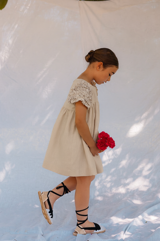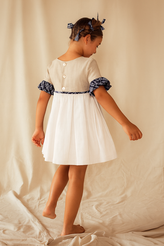 Vestido Barraca CORTO con canesú en lino algodón tierra y falda en lino algodón blanco