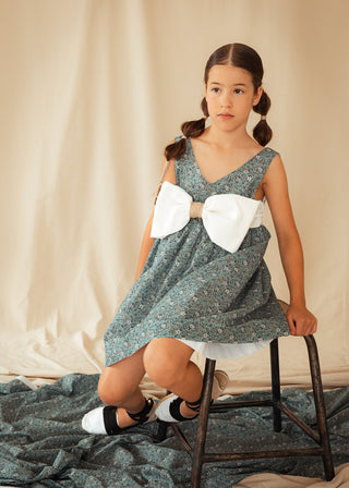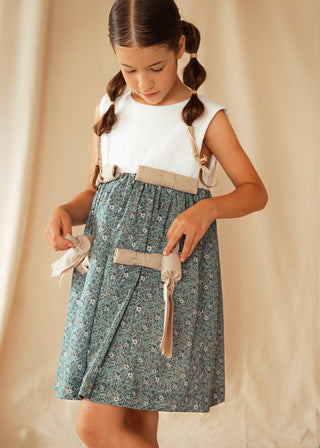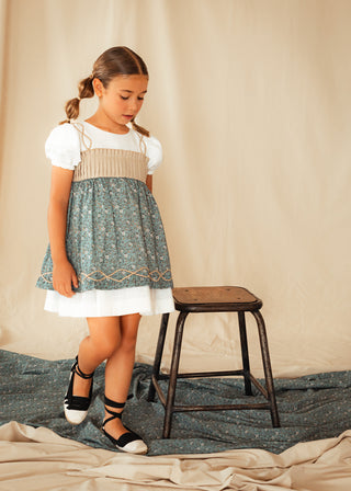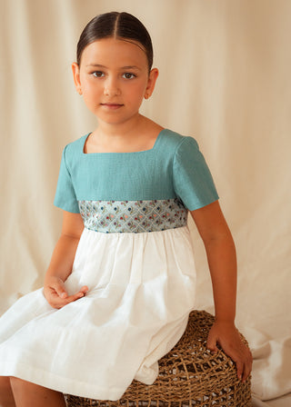 Vestido El Palmar MIDI opción otoño invierno con canesú en damasco blanco y falda en viyela azul índigo