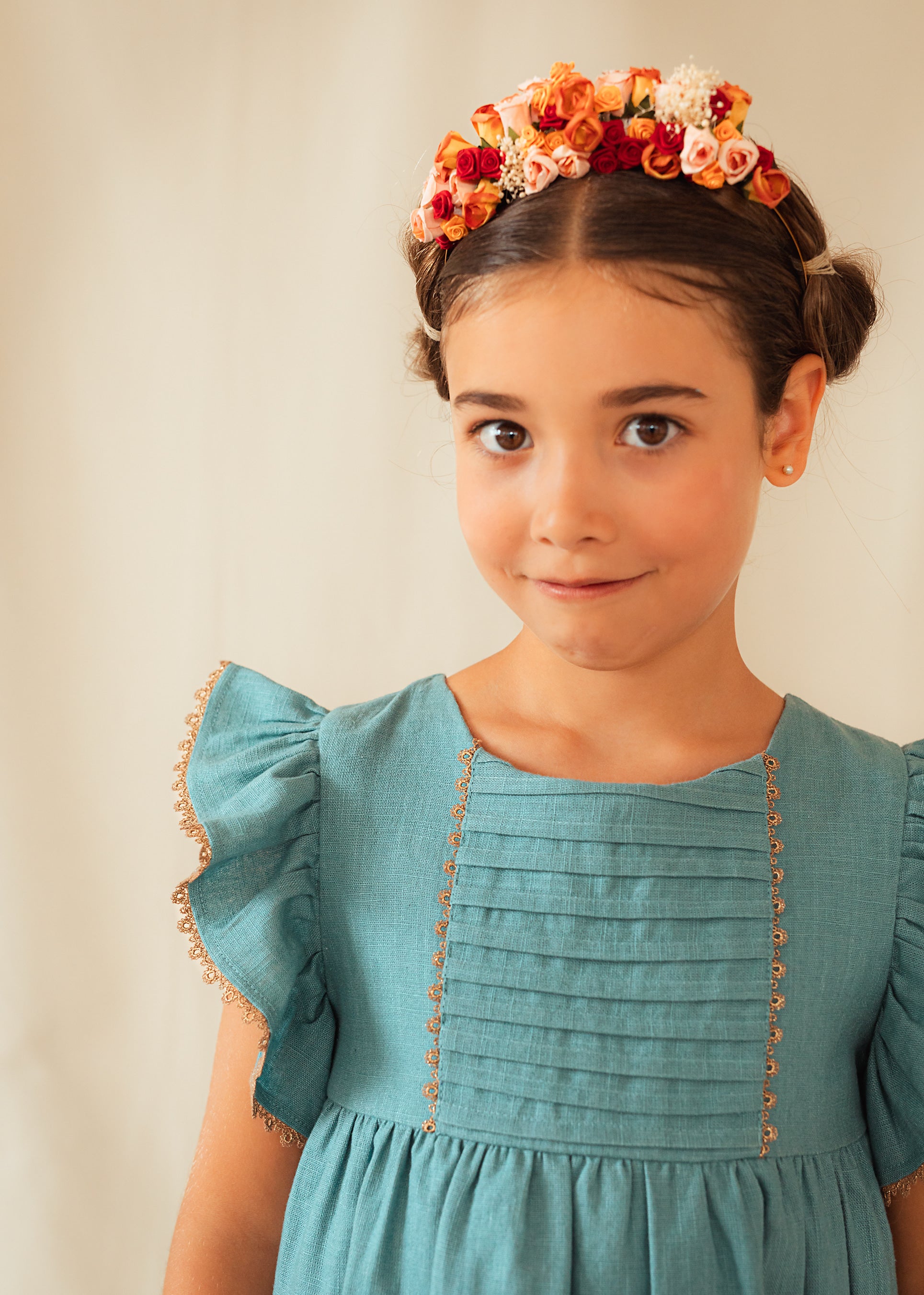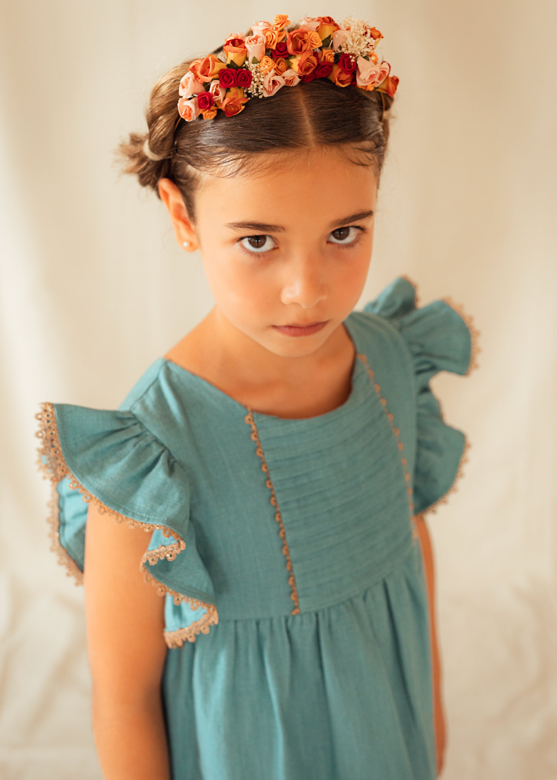 Vestido Cullera con jaretas en bajo y canesú inspiradas en las olas del mar. Con puntilla de hilaturas doradas inspiradas en el color arena de las playas de Cullera. Confeccionado en lino algodón color azul turquesa. Puedes elegir cualquier color lino de nuestra colección y además  elegir la versión corta o la versión midi a partir de la talla 6 años. Consulta nuestra tabla de tallas.