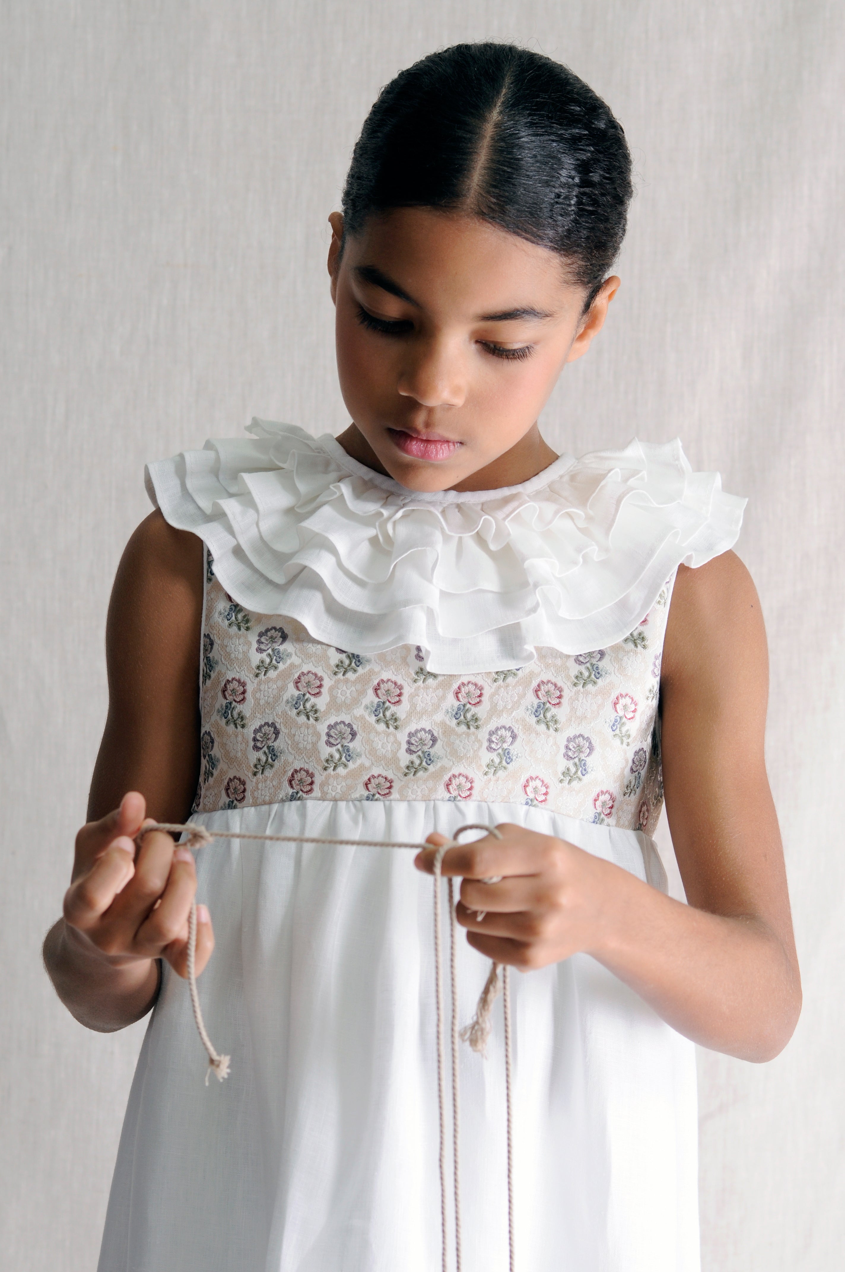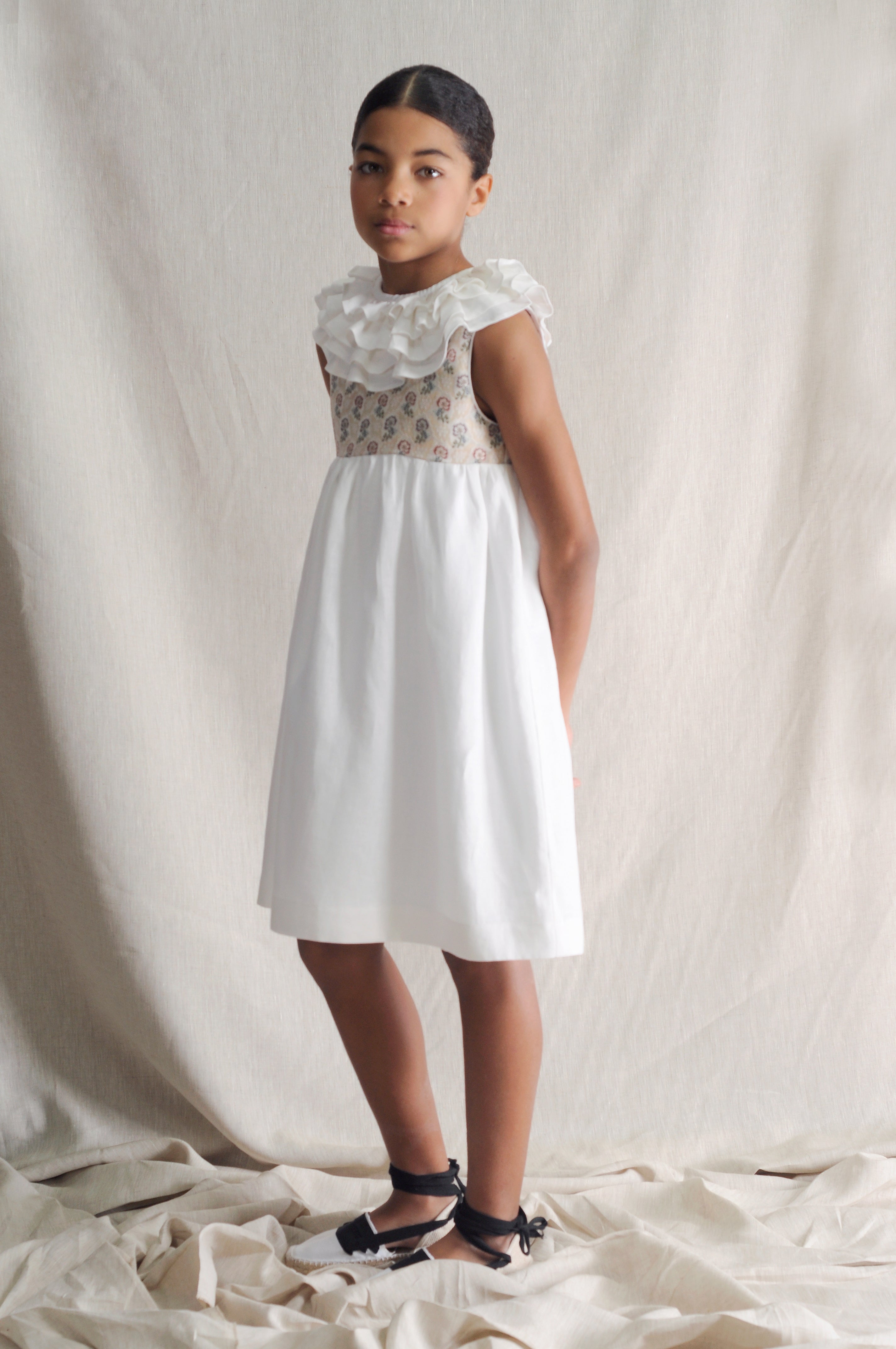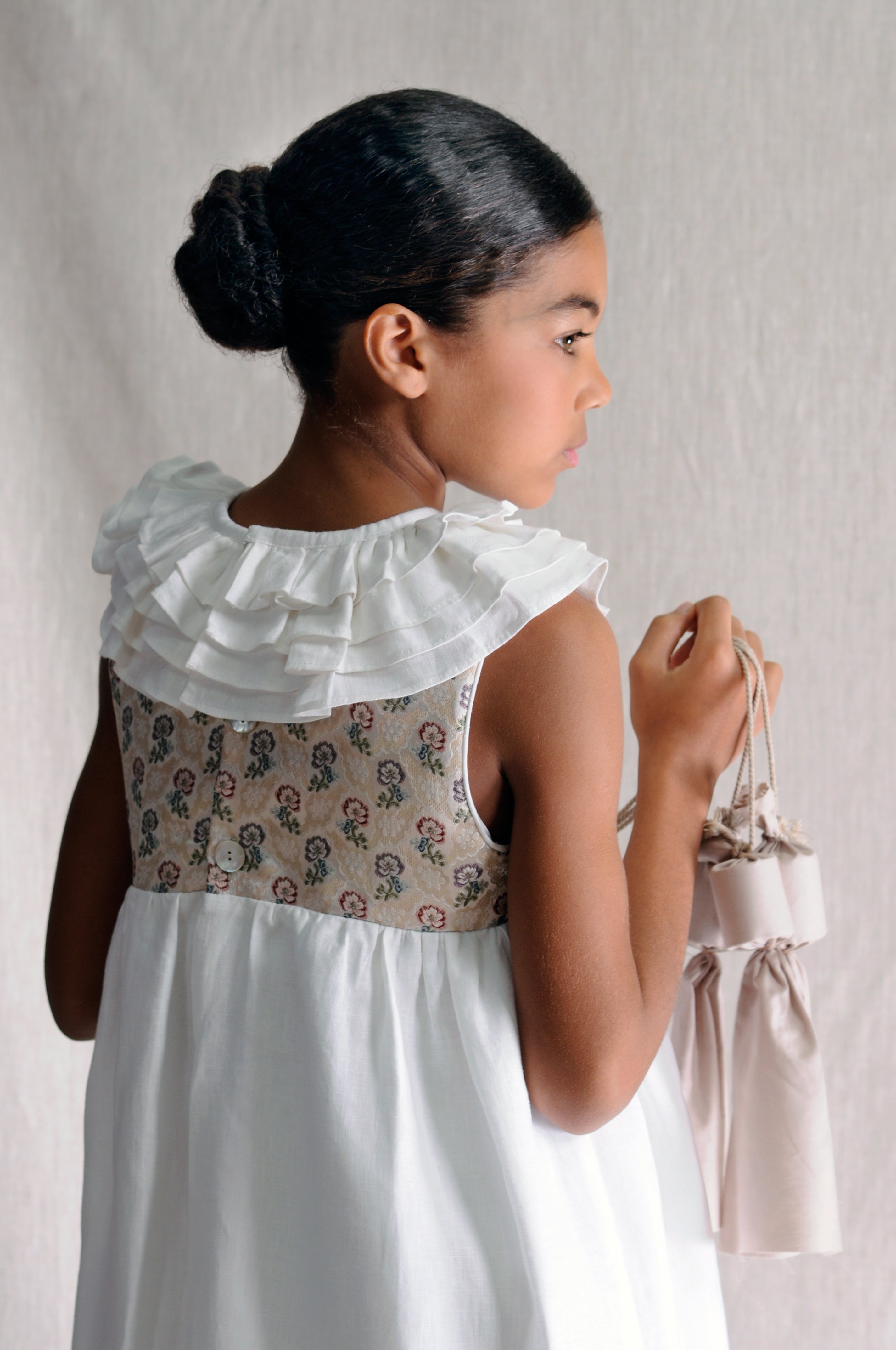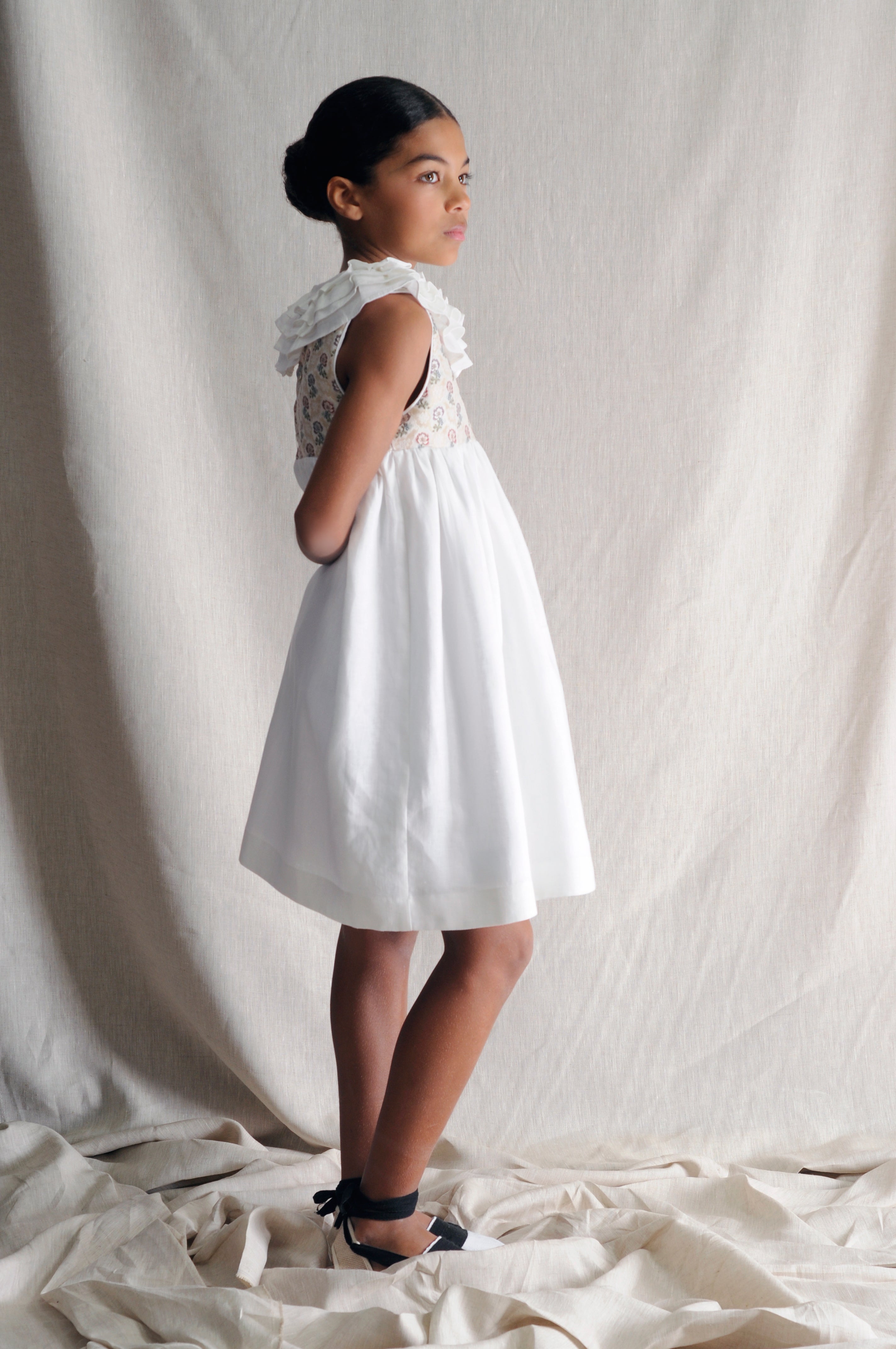 Vestido de ceremonia infantil de inspiración valenciana, confeccionado en lino color blanco y canesú en tejido original de fallera.