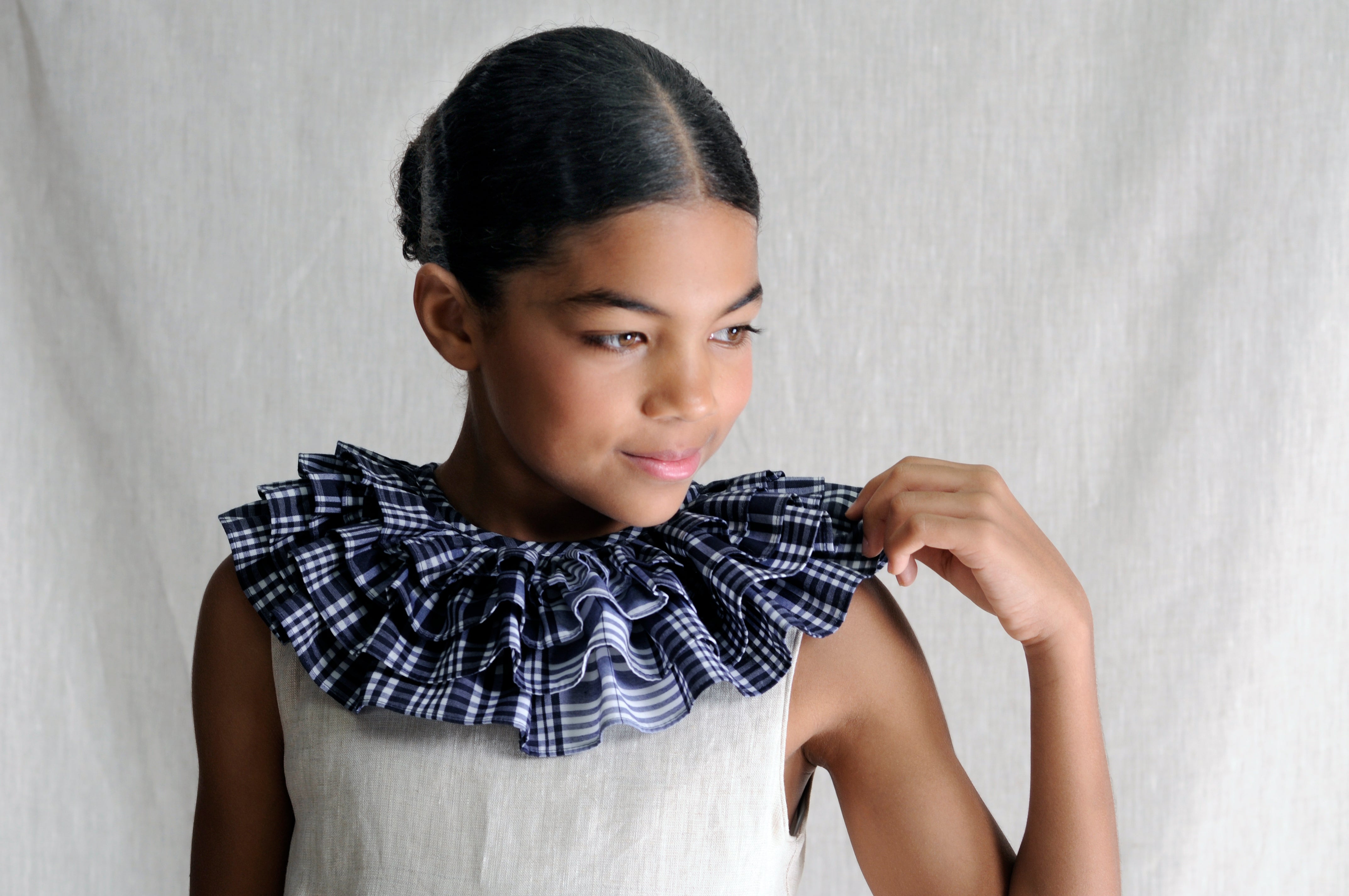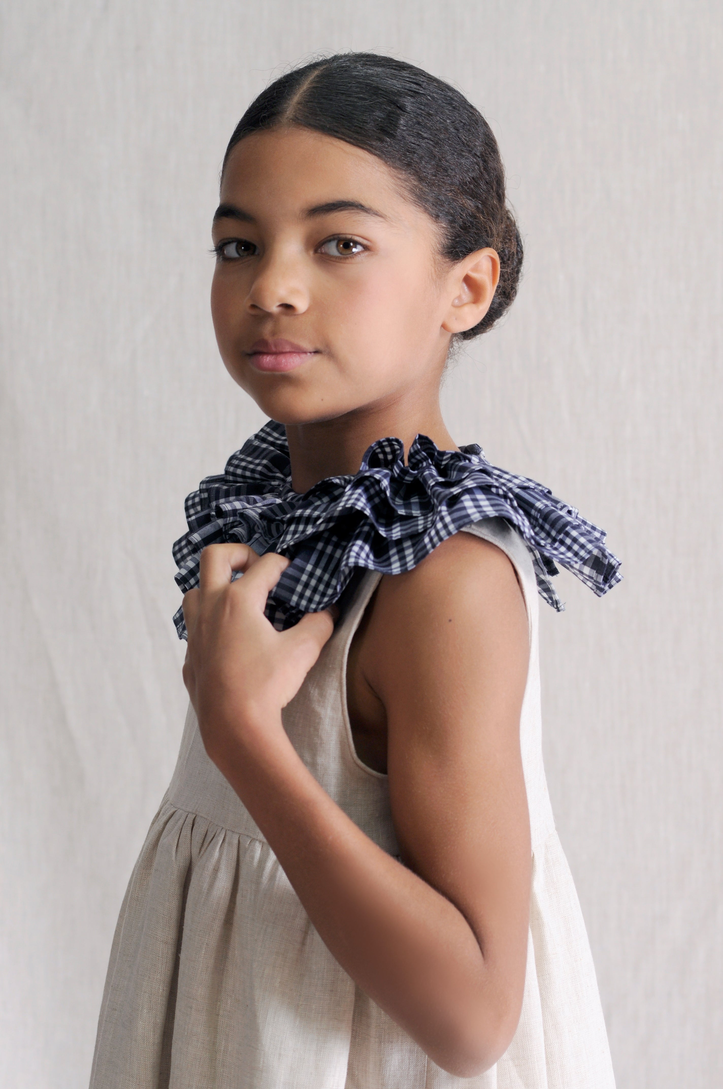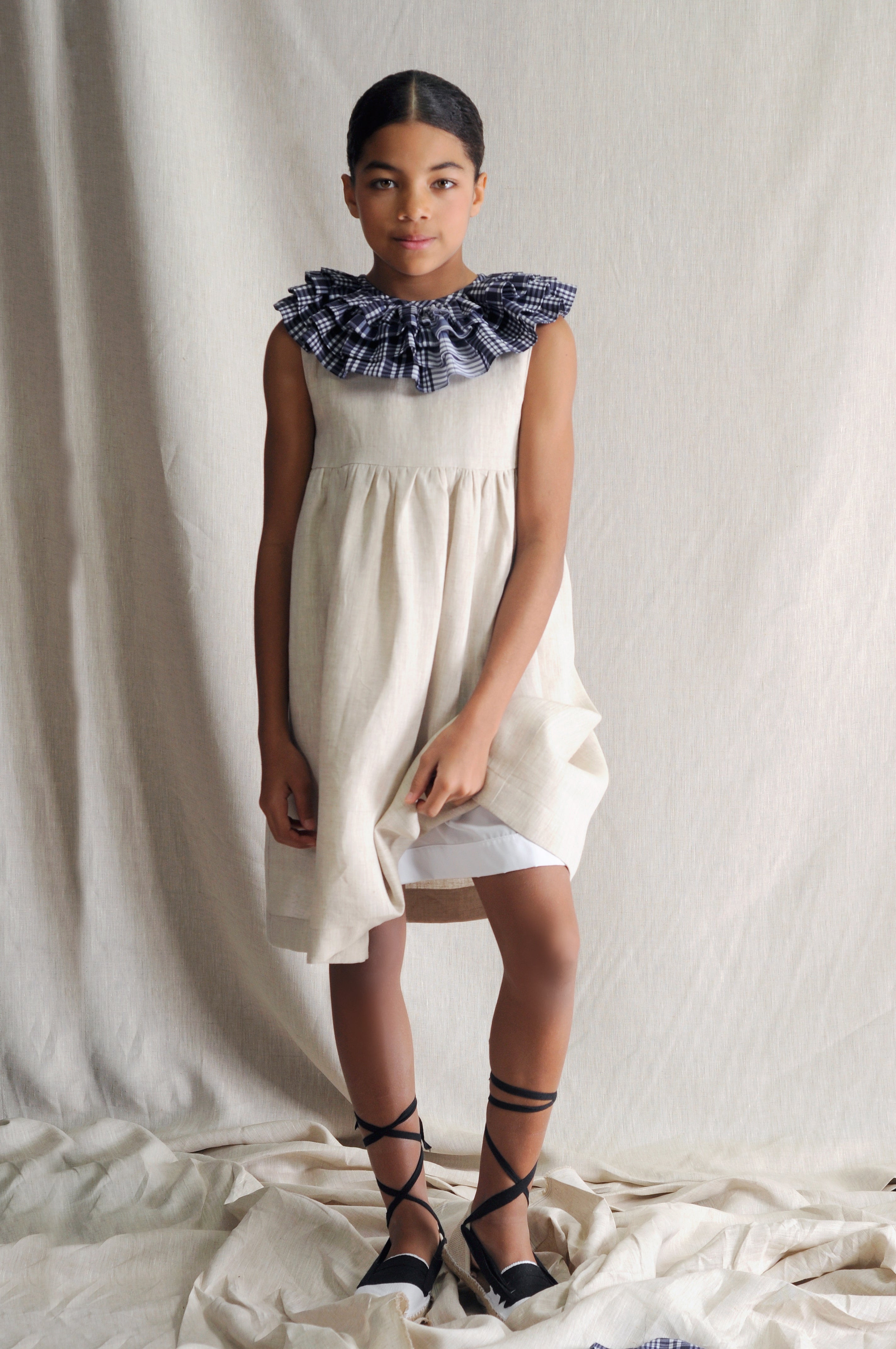 Vestido de ceremonia infantil de inspiración valenciana, confeccionado en lino color arena y cuello en tejido regional fallero.